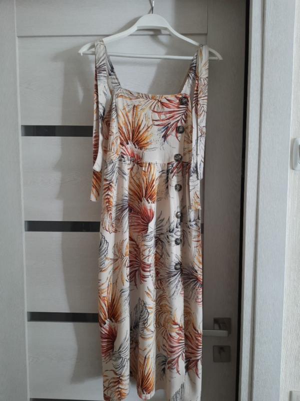 платье женское летнее, на брителях, в идеальном состоянии, размер указано 36,ткань вискоза, с левой стороны с верха до низа пуговицы пришиты (не растежутаются)ная брительницами дополнительно пасочки чтобы завязывать на бантик,з левой стороны по ноге идет разрез 38см.,в зади на спине резинка не большая 11см. Замеры:длина в переде 90см, в зади 81см, пог.40/41см,пот.41см(тянется чуточку),поб.62см.