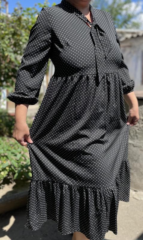 Сукня легка , не зважаючи на довгий рукав , не жарка! Колір: чорна в білий горох Розмір: М ( модель розмір 48)