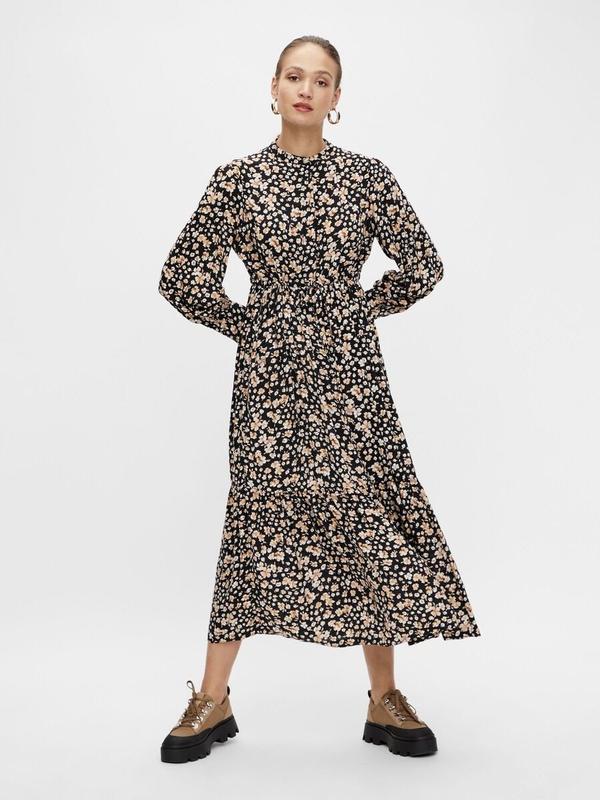 Y.A.S YASEMALLA Довга сукня з довгим рукавом з віскози, чорна з квітковим принтом, талія зібрана на пояс, знизу волан. Повністю на ґудзиках. Вільного крою. Сукня універсальна підходить для весни-літа також можна носити і восени . Розмір L Довжина 136 см Полуобхват талії 50 см регулюється поясом Полубхват грудей 55 см 100% віскоза