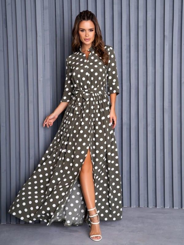 14141_хаки Довга сукня кольору хакі в горох, виконана з софту. Сукня приталена гумкою та оснащена розкльошеним низом максі довжини. Модель з рукавами довжиною 3/4 та коміром-стійкою з розрізом у горловини. Сукня з бічними кишенями, розрізом спереду та знімним поясом.