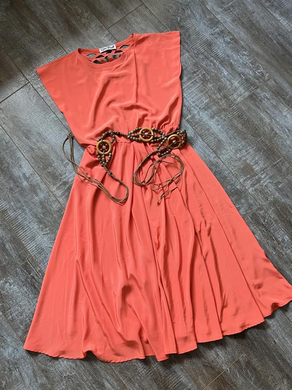 В идеальном состоянии Пояс - резинка тягнеться На фото есть пример с ремешком и без Платье продается без ремешка Замеры на фото Бирка с составом ткани срезанная Выглядит на полиэстер, нейлон, вискоз