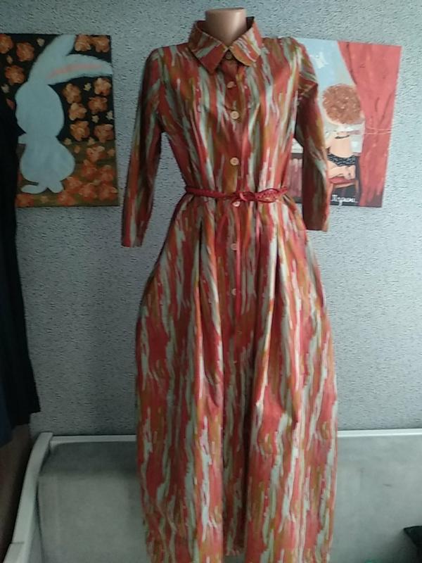 красивого кроя, которое обработано швом с середины, тканная ситец, продается без ремня, пятно возле кошени, пог56,пот50,поб свободное,рукав50,длина 143.