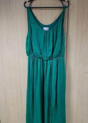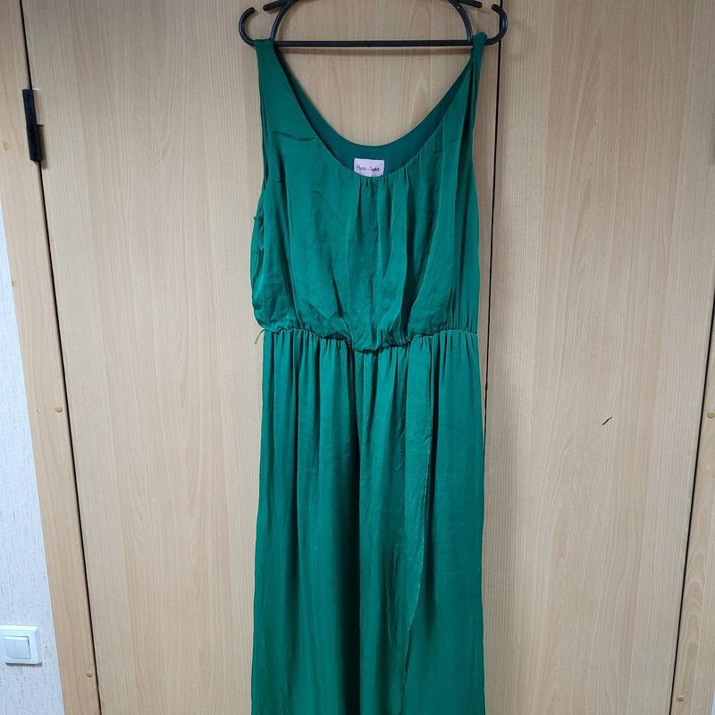 Длинное шелковое платье без рукавов на тонкой трикотажной подкладке.Талия на резинке.Впереди запах.Новое,без бумажной этикетки.Изумрудного цвета.Ог 106,талия 76+, Об 126,длина 146,