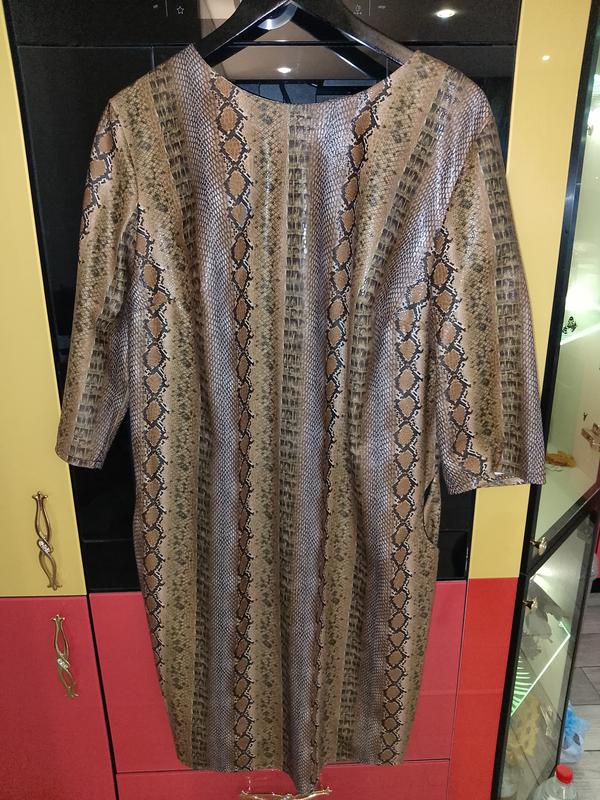 Продается женское платье.Цвет коричневый,ткань под питон.Замеры:длина 101 см,плечи 45 см,грудь 56 см,талия 58 см длина рукава 44 см,есть карманы.Пересылаю.Размер 56.