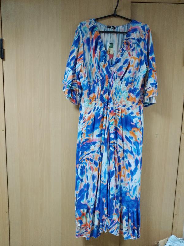 Длинное платье с абстрактным принтом.V- образный вырез на резинке,под грудью мелкие резинки.Рукав с оборками,внизу оборка.Ог 110,Об 140,рукав 45, длина 120.Сзади прострочено мелкими резинками.