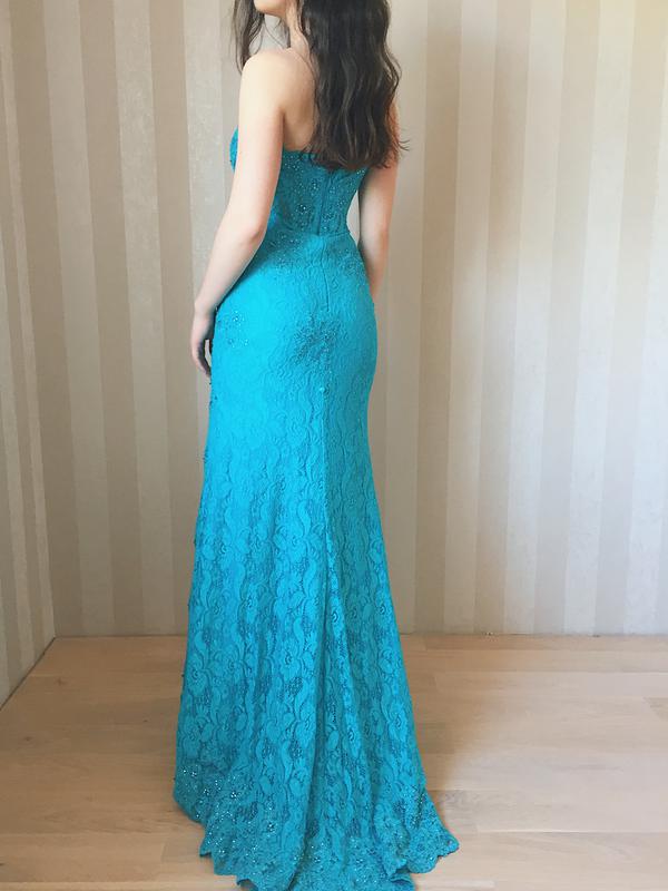 Красивое голубое платье, по всей длине расшито кружевом и камнями. Есть немного зацепок. Под низом подкладка. Спереди разрез с одной стороны. Сверху сделано как корсет, но без шнуровки. Есть чашка, размер В {на фото одет на А}. Было надето один раз