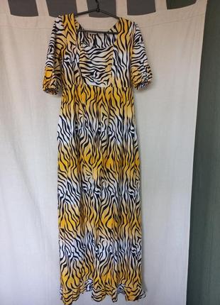 очень красивое длинное платье, с вытачками, стильный принт, женственные рукава, рюши внизу цвет желтый, черный, белый на спинке молния