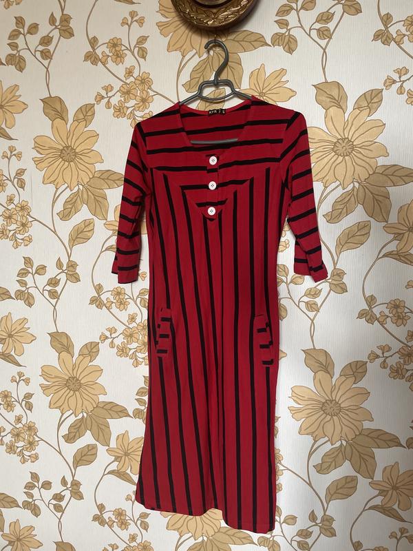 Красное хлопковое платье в полоску с кармашками.