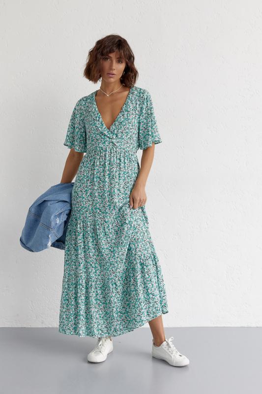 Легкость и элегантность в каждом движении - с таким красивым платьем в цветочек тебе захочется парить над землей, как бабочка над цветочным поляном! В модели низ украшен высокой оборкой, которая в свою очередь обрамляет вырез горловины. Талия на спинке дополнена вшитой резинкой. Верх платья спереди идет на запах, горловина V-образная. Короткие свободные рукава идут без резинки.