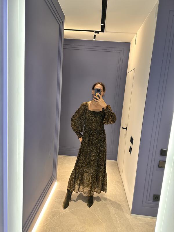Платье леопринта, по порпусу выполнено маленькими резинками, на меня больше всего носила с не продающимся пояском. Есть подкладка черного цвета. Размер 36, состав полиэстер. Длина изделия 134 см Ширина плечей 80 см Длина рукава 60 см Ширина мандету 11 см Объем груди 90 см Объем талии 86 см Обсяг стегон 140 см Ширина волана по низу виробу 31 см