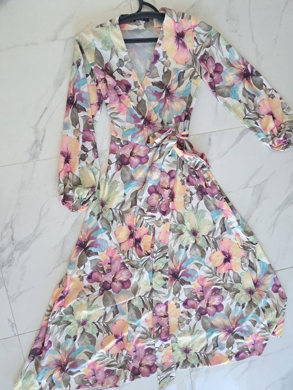 Изысканное платье на запах, цветочный принт. Надела 1 раз на фотосессию. Сейчас она на меня мала. Размер С и М, так как на запах фиксируется на поясе.