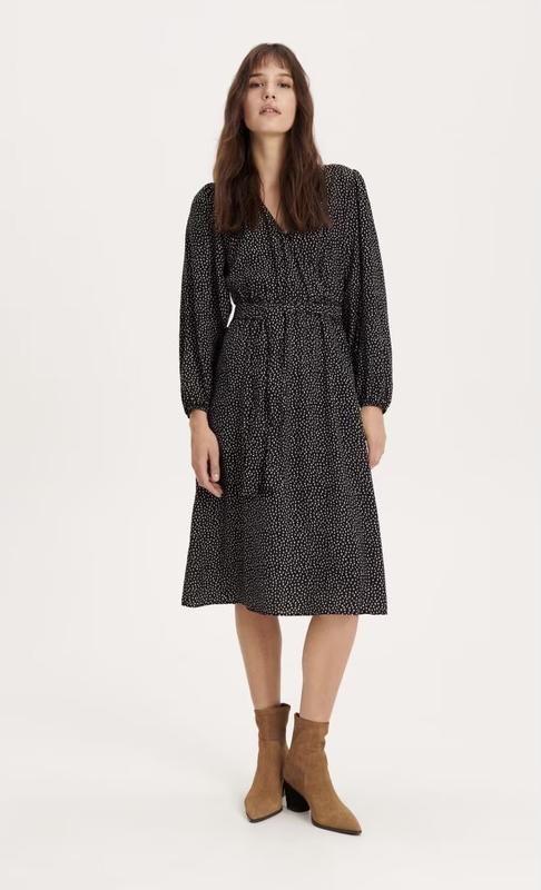 V-образный вырез с запахом длинные рукава с оформленными резинкой манжетами эластичный пояс с резинкой пояс на талии длина меди