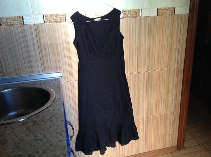 Плаття чорного кольору,тканина з елементами легкого "букле".Сукня з підкладкою,за рахунок натуральних матеріалів (100% бавовна) основна тканина і підкладка,в ньому дуже комфортно.Збоку блискавка,є пояс,внизу спідниця має два ряди оборки.Спідниця злегка розширюється до низу.ПОГ 42 см,ПОТ 37 см,ПОБІДИ 43 см,довжина виробу по спині 105 див. Дивіться мої інші оголошення.