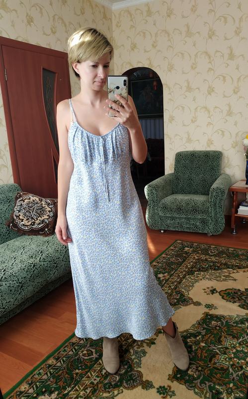 Очень женственное платье в бельевом стиле. Выполнена из тяжелой атласной вискозы голубого цвета в цветочный принт. Крой по косой, поэтому платье садится красиво по фигуре. На фото одето на параметры 88-70-95см, рост где-то 165-167. Состояние отлично 👌 Размер указанный 48EU Длина без учета бретелей 113-114см Пройма 32-34см Ног 58см Нот 59см Нос 67см Желтое платье тоже в наличии!