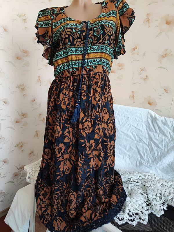 Лёгкое шикарное платье в цветочный этнопринт. Овальный вырез на шнурке. Смотрится очень эффектно и стильно. Низ юбки обвязан тонким кружевом. В плечах 40 см. Короткий рукав 11 см. Длина по спинке 116 см. ПОГ-ПОТ-ПОБ 44-36- 62 см. В талии на резинке, тянется до 50 см. Юбка к низу расклешенная. Бирка срезана. Ткань лёгкая, натуральный хлопок. Состояние идеальное. Следы ношения отсутствуют. Дефектов нет.