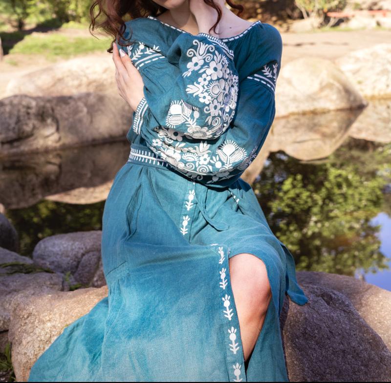 Элегантное вышитое платье в бирюзовом цвете. Бренд FolkMart. Универсальный фасон подойдет на размер от M-L до S (яtra s), но платье широкое, богато запахом, большим объемом по талии, который можно корректировать поясом. Платье длинное, к полу. Тканина - льон. Вышивка белая - гладью на рукавах, удлине платья и по бокам. Шикарное украинное платье для фотосессий, концертов! Удобно стирать, гладить, очень стильная - универсальный размер регулируемый