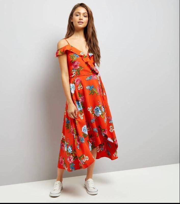Яркое платье от New look😍 Стан нового. Ткань легкая и приятная к телу, имитация на запах, есть скрытая кнопочка, под грудью сшита, к низу свободная, открывает одну ножку. С левой стороны под рукой есть молния. Плечи обнаженные, спущенные рукавчики. Размер S-M