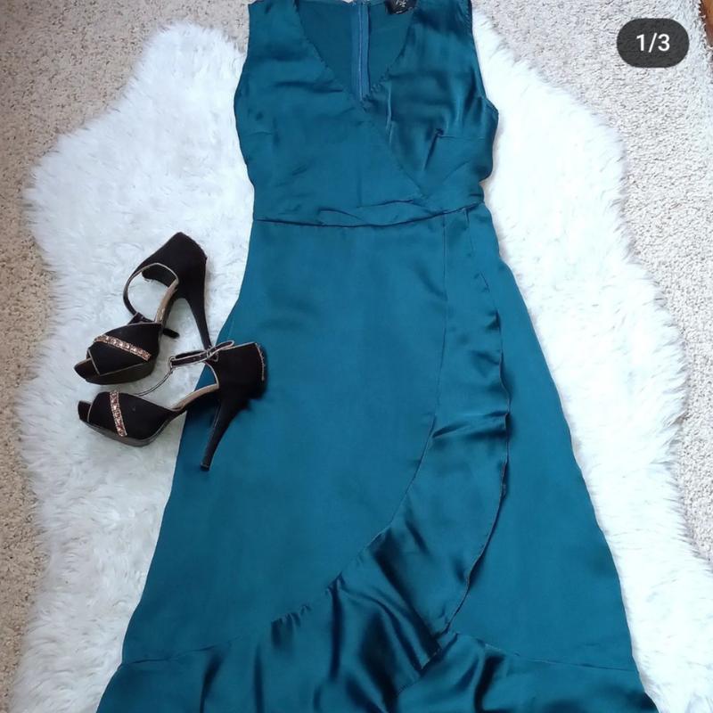 Сатиновое платье,митация на запах, ткань легкая, очень красивый цвет,размер М.
