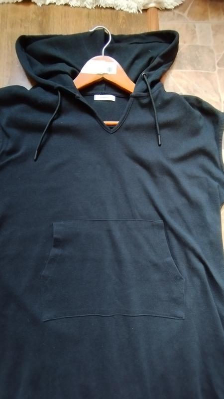 Плаття худі. Кишені кенгуру, без рукавів. Можна носити під водолазку, гольф, футболку. Дуже зручне та практичне. По бокам є невеликі розрізи. Колір насичений чорний. Фото не передало. Відповідь дам на всі запитання і вишлю додатково фото ПОГ 61, Довжина 107. Чудово тягнеться. Одягала дуже мало. 100 процентний котон. Тканина полотна і якісна. Спортивне плаття з капюшоном.