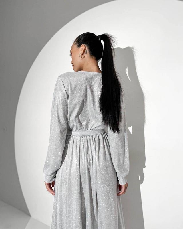 Блестящее платье макси с высоким разрезом на ноге Изысканное вечернее платье макси с невероятно сияющей ткани, особого эффекта оказывает высокий разрез по ножке. Это отличный вариант для празднования Нового года, дня рождения, или другого мероприятия. Размер: ONE-SIZE S/M Материал: трикотаж люрекс-диско
