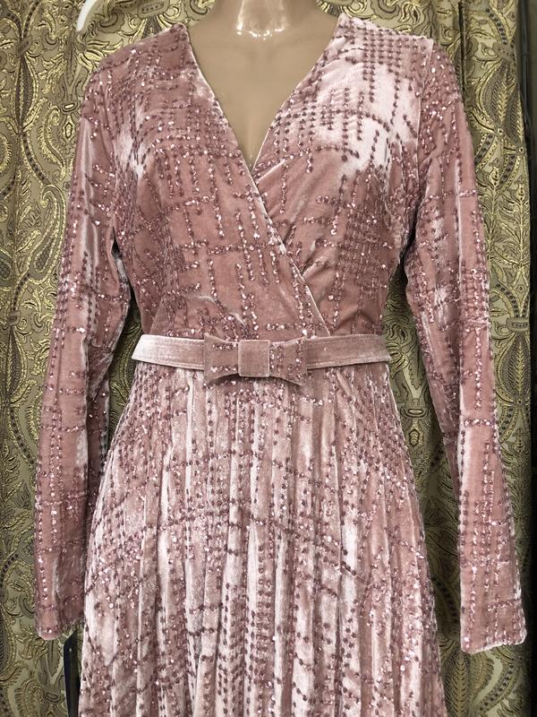 длинное плюшевое платье с пайетками, на подкладе по всей длине. Юбка - легкое плиссе. Маломерит на размер. Потайной замочек сбоку.
