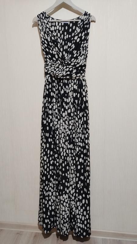 Длинное роскошное платье Moschino в абстрактные горошины. В плечевые швы заложены складки. V-горловина спереди+ запах+ складки. Красивая плотная вставка по талии, удерживает фигуру. Застёжка сбоку на молнию. На подкладке. Платье из натурального шелка, бирки с составом нет, но это бесспорно натуральный шелк. Бирка с размером отсутствует, ориентируйтесь пожалуйста на замеры, с удовольствием отвечу на все вопросы! Длина 159 Пог 48 + складки+ запах. Размер груди может быть любой Пот завышена 33,5 Бедра свободно