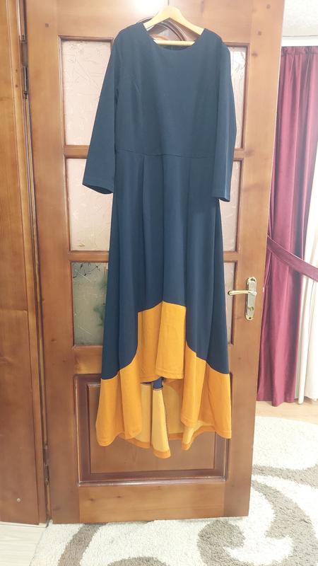 длинное платье сзади более длинная спереди короче SHEIN cтан очень красивый темно синяя, внизу горчичная Тканина тягнеться ззади слитный замок длина рукава от плеча 44см 3/4 ПГ 44см длина спереди 111см длина ззади 135см