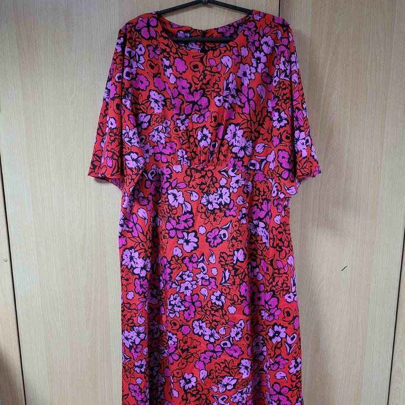 Длинное платье большого размера, талия завышена под грудь,сзади змейка.Красное.Новое, без бумажной этикетки.Люкс сток. Он 122,талия 108,Об 126, рукав 35, длина по спинке 131.