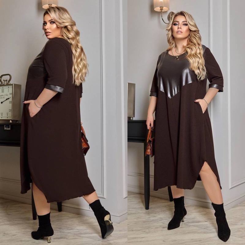 Платье. Модель : 850/1525 Цена: 1200грн Ткань: креп дайвинг + эко -кожа Турция. Размеры: 50-52, 54-56, 58-60, 62-64. Цвет: шоколад, черный и капучино. Комбинированное женское платье,выполнено из креп дайвинга и эко-кожи. Модель свободного кроя позволит скрыть лишние сантиметры талии и выглядеть современно. Длина миди. Вырез округлый, верхняя передняя полочка из эко-кожи. Рукав 3/4.Подол асимметричный с красивыми вырезами . В боковых швах карманы. Длина платья 115 см. Платье станет любимым нарядом для девушек , который стремятся покупать удобные и одновременно стильные в