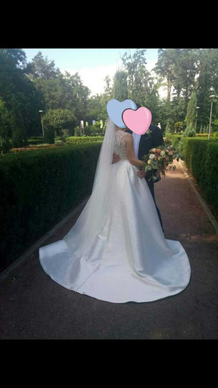 Стильное изысканное свадебное платье, хорошо сидит на размер S, не тяжелое. Юбка “А-силует”, впереди прозрачная ткань красиво подчеркивает декольте. Есть небольшой шлейф,который пристегивается, застегивается на пуговицы,которые нашиты по всей юбке. Возможен торг!
