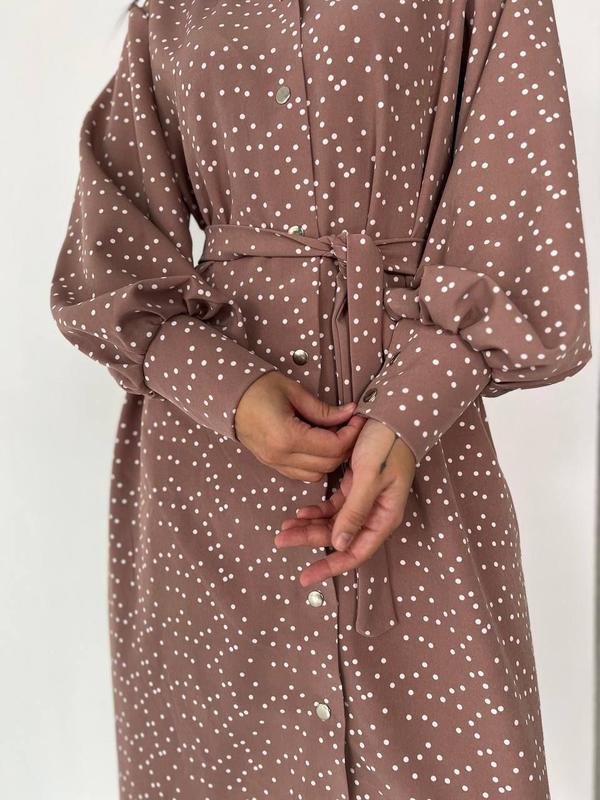 Стильна сукня в горошок Мод #I₽M 112 Тканина - костюмка ; Размеры :42-44,46-48,50-52 Стильное молодежное платье,в котором ты будешь выглядеть стильно и практически.Длина миди.Одевается под пояс.Застегивается на кнопки.Стильный рукав - «Фонарик». Кольори :чорний,беж,зелений Цена :670грн❣