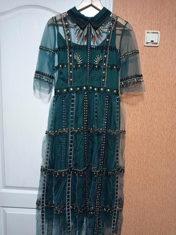 Сукня виготовлена з м'якої сіточки з вишитим візерунком,з середини пришита комбінація,яка не просвічує.Дуже елегантне та дорого виглядає.Було одягнене лише раз для фотозйомки Довжина по спинці від коміру 130 см,до поясу 40 см,плечі 39 см,рукав 40/23 см,напів обхват талії 40-41см,не тягнеться,в стегнах вільно