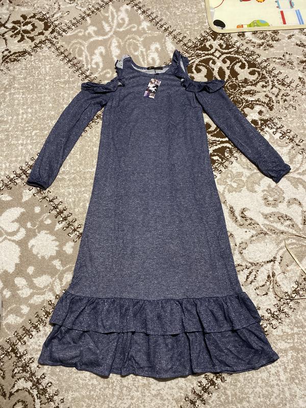 Розмір 38(44) ПОГ 44, ПОТ 44, ПОБ 52, довжина 120, рукав 45. Тканина трикотаж петля з люрексом, колір синій джинс