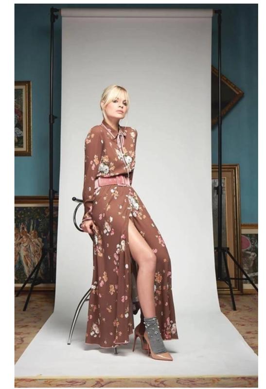 Шикарное длинное платье коричневого цвета в цветах итальянского бренда Denny Rose. На шее завязывается тонкий розовый бархатный бант. Пуговицы перламутровые Размер ХС-С