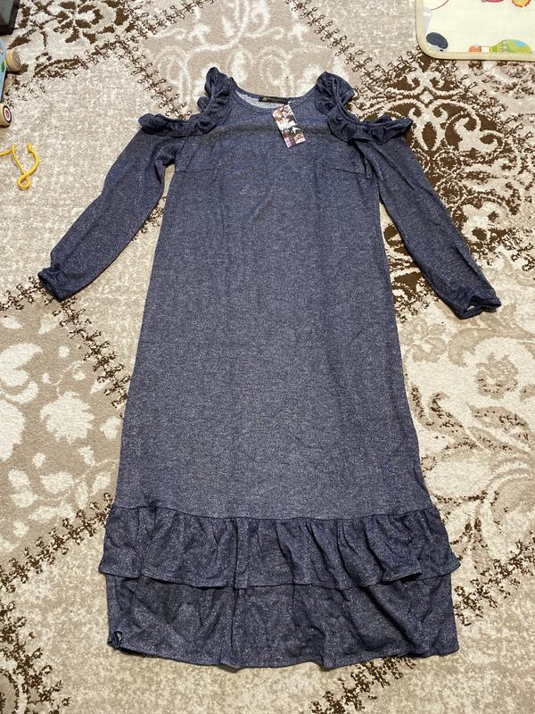 Розмір 42(48) ПОГ 48, ПОТ 48, ПОБ 55, довжина 123, рукав 45. Тканина трикотаж петля з люрексом, колір синій джинс