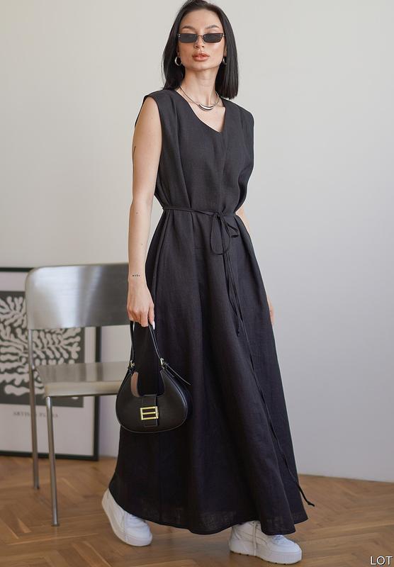 Черное платье макси без рукавов с v-образным вырезом и поясом из натурального льна