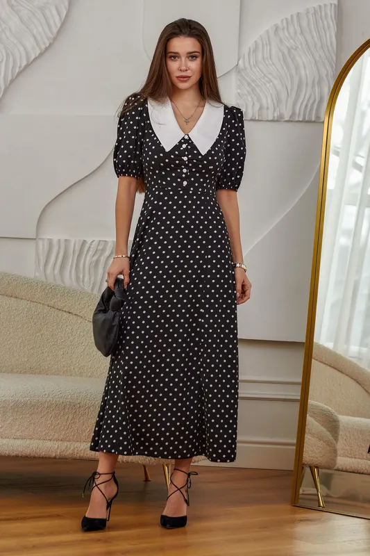 Макси платье в горох приталенное длинное платье с воротником платья макси черное