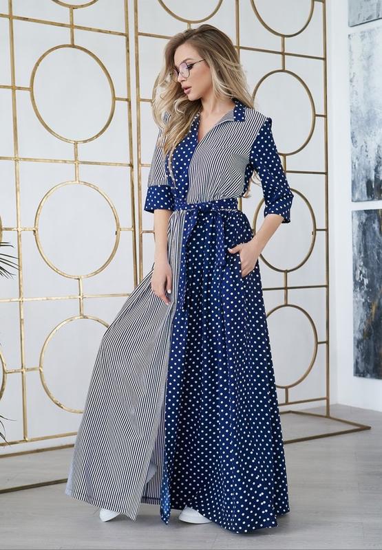 Довге приталене плаття синього кольору виконане з софта з комбінованим принтом в смужку і горошок. Модель з довжиною в підлогу з розкльошеною вільною спідницею і розрізом. Плаття з клиноподібною горловиною оснащено комірцем і вільними рукавами довжиною 3/4. Модель зі знімним поясом і кишенями. Розмір S (42-46) Довжина переду виробу - 61см Ширина під проймами рукавів (над грудьми)- 46см Ширина талії - 25-35см (тягнеться) Ширина стегон - 75см Довжина - 150см Довжина рукава по внутрішньому шву - 37см Тканина трохи тягнеться, матеріал Софт, склад: 59% поліестр, 21% еластан, 20% бавовна Одягнута 1 раз, стан нової