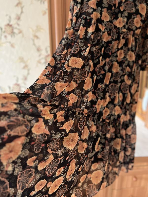 Чудова довга сукня! В міру прозора, є підкладка. Легка, повітряна. Підійде як повсякденна, так і на свято! Колір: чорна з принтом (помаранчеві квіти). Довжина 130 +см Плечі 36,5 см Рукав від плеча 59 -60см Можна під пояс (є шлєйкі), але купувала - поясу не було. Розмір оверсайз. підійде як для S, M, L, можна навіть приміряти і XL