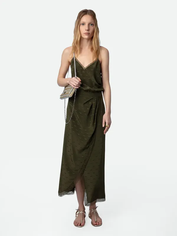 Длинное платье, жидкое нижнее белье Wakame цвета хаки - Шелк с жаккардовыми крыльями - Нерегулируемые тонкие ремни - Кружевные полоски - Отмечен на талии - Драпированная и асимметричная юбка