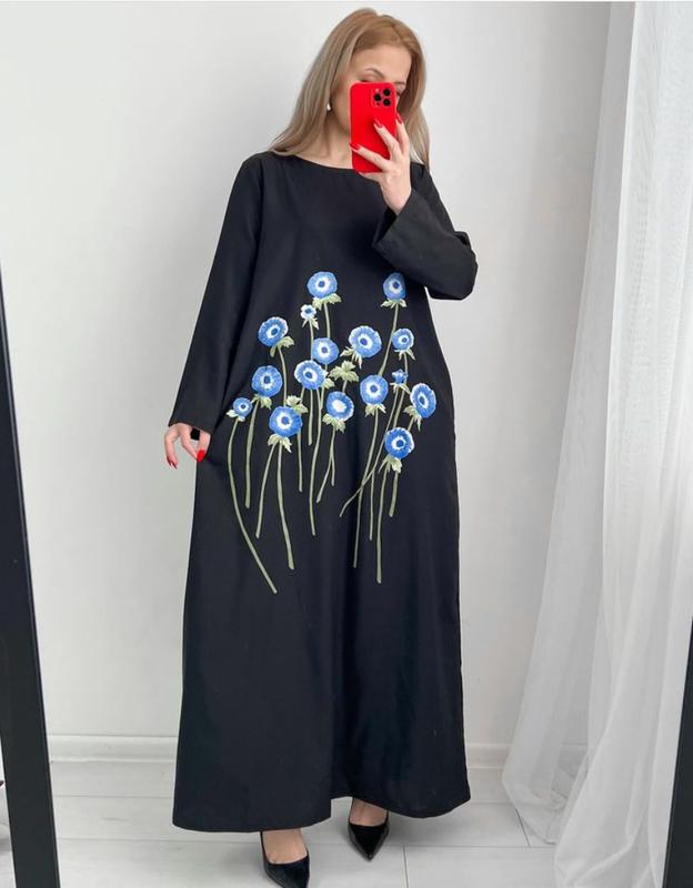 черное платье с принтом размер XL полиэстр полуобхват: грудь-60см талия-свободно(60см) стегна-68см рукав-59см Длина платья-145см