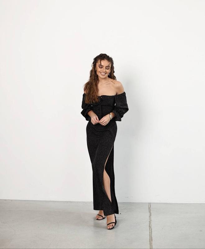 Платье макси с разрезом и завязкой на груди софт в горошёк
