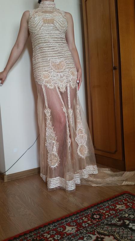 Красива сукня розшита бісером. ЕКСЛЮЗИВ!!!. Чудовий вибір до особливої події. Шлейф,защіпається вгорі на 2 гудзика. Довжина плаття спереду 154,зад-196. Ширина плечей 36. Обхват грудей 81. Обхват талії 64. Розмір S/M. Відповім на усі додаткові запитання..