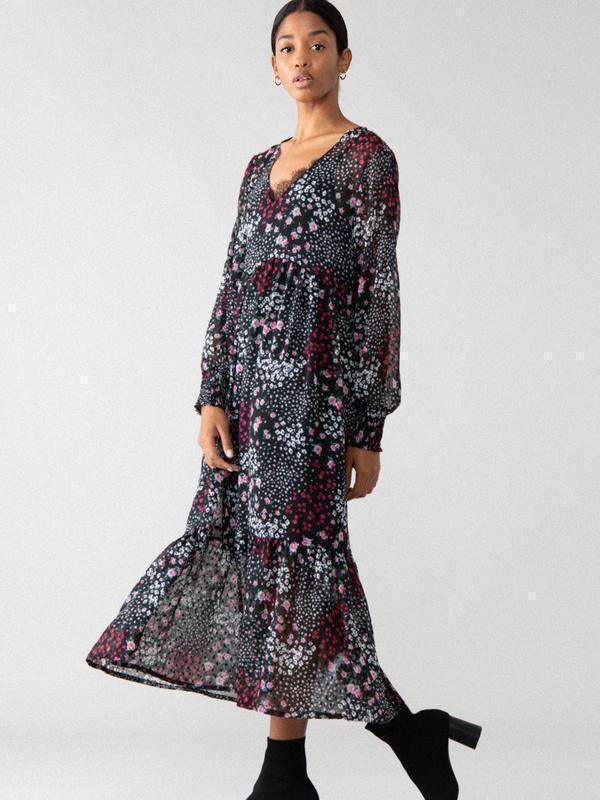 Красивое длинное шифоновое платье Lefties в цветочный принт. Размер в наличии L. Внутри сарафан-подкладка комбинация с кружевом на декольте. Рукава снизу на резинке. Завышенная линия талии. L: Верхнее платье: ПОГ 51 см ПОТ 48 ПОС 75 Длина 125 см, Рукав 62 см Сарафан подкладка хорошо тянется: ПОГ 46 см ПОТ 44 см ПОС 54 см Длина 92 см