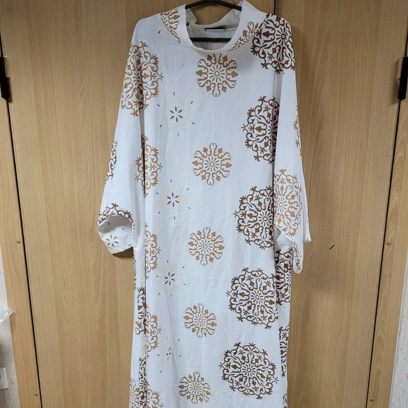 Платье балахон очень большого размера. Воротник стойка, рукав спущенный, молочного цвета. Новое, без бумажной этикетки. Люкс сток. Ог 150, Об 185, рукав от ворота 66, длина 133.