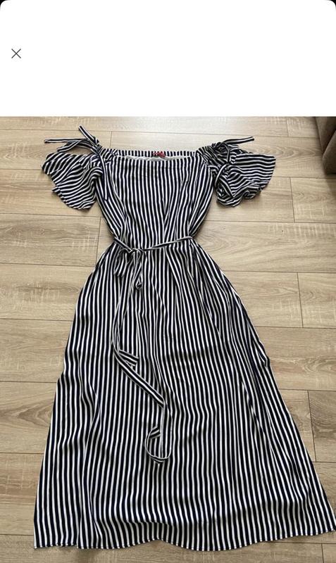 Платье в идеальном состоянии, в полоску белая с темно синей, люксового бренда из вискозы, подкладка мелкая сетка, прямое под пояс с врезными карманами и глубокими разрезами по боках На бирке размер 38 пог 50 см, длина 127 см