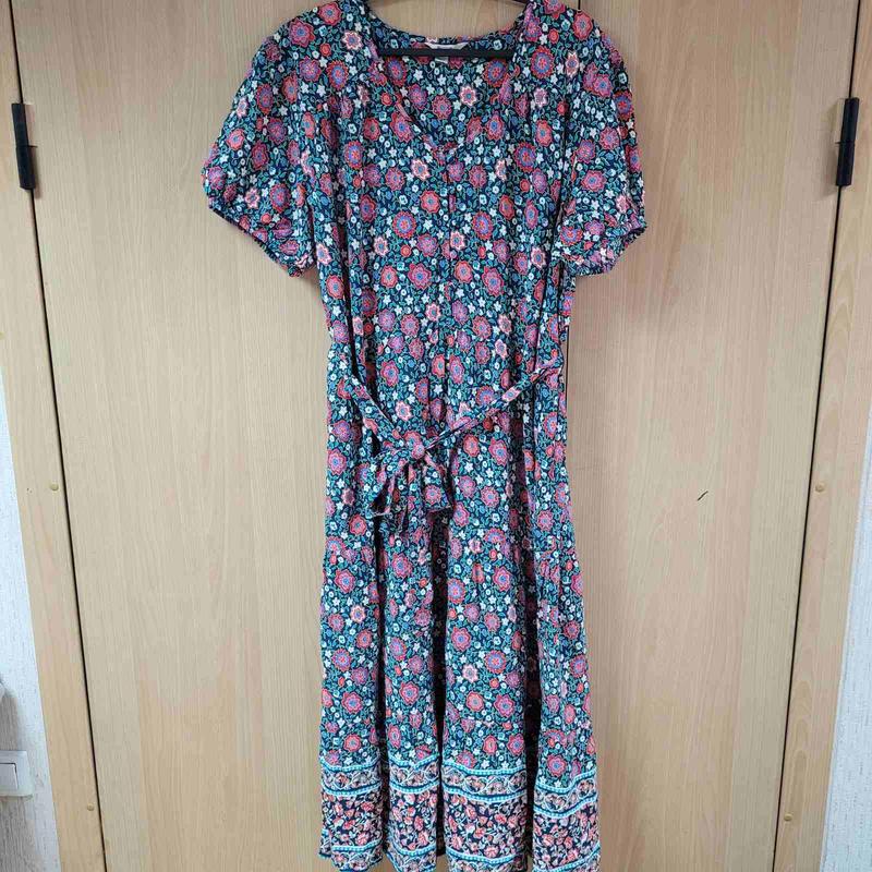 Длинное вискозное платье с поясом, талия сзади на резинке, рукав реглан на резинке, спереди до талии пуговицы. Новое, без бумажной этикетки. Ог 112, талия 92+, Об 140, рукав от ворота 35, длина 124.