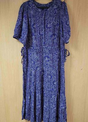 Длинное вискозное платье большого размера, рукав-реглан внизу на резинке, талия на двойной кулиске, впереди до талии пуговицы, юбка ярусная, цвет сине-фиолетовый. Новое,без бумажной этикетки. Люкс сток. Ог 115, талия 102-, Об 120, рукав от ворота 41, длина 125