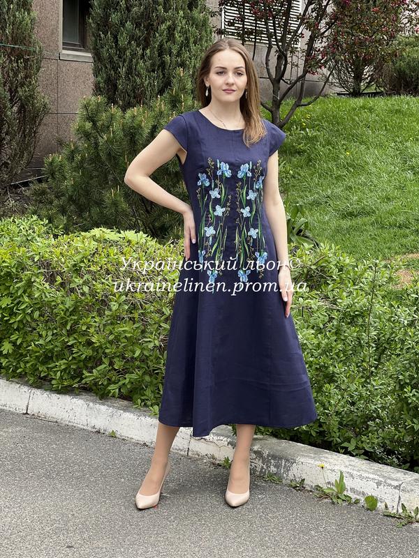 Платьеверное синяя галерея льна, платье, миди, льняное. вышиванка, 42-52рр