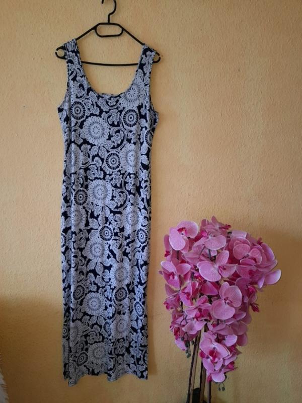 Платье темно синего цвета в белый арнамент. Очень приятное к телу, состав срезан, но точно хлопок, по бокам разрезы 33,5 см Платьице тянется Длина 133 см ПОГ от 47 см до 62 см ПОТ от 45 см до 60 см ПОБ от 52 см до 62 см Смотрите мои другие объявления Отправка Укр или Новой почтой Оплата на карту Приватбанка